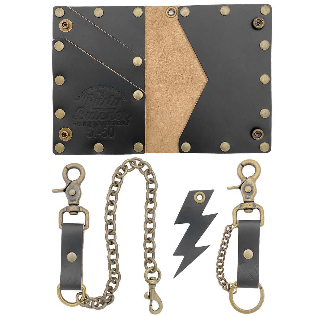 The Collector Full Set offers a high-quality, handmade leather biker wallet with durable brass hardware. With a lifetime guarantee, you can trust in the longevity of our product. Invest with confidence in a product that will last a lifetime.